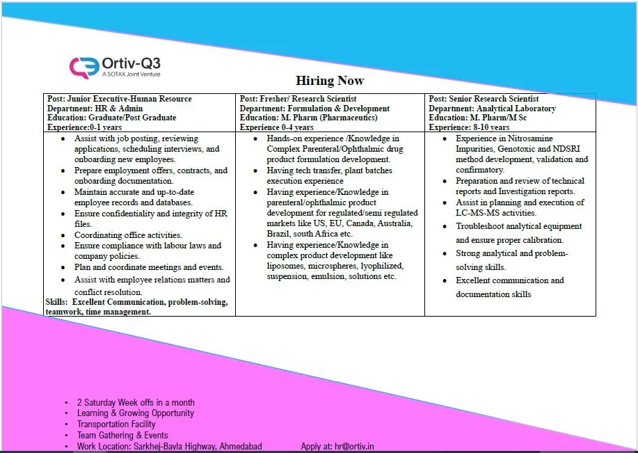 Ortiv-Q3 Pharma Services -Hiring Research Scientist – M.Pharm Fresher Apply