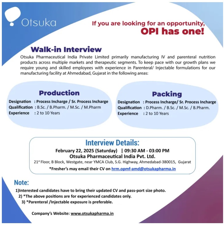 • Interview Venue: Otsuka Pharmaceutical India Pvt Ltd, 21st Floor, B-Block, Westgate, Nr. YMCA Club, Sarkhej – Gandhinagar Highway, Ahmedabad, Gujarat 380015