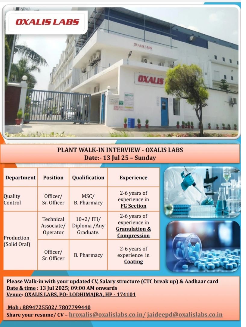 Oxalis Walk-In Interview For QC & Production on13th July 2025Β Oxalis Walk-In Interview For QC & Production on13th July 2025Β Post Views: 352 Job Category: Pharma Job Type: Full Time Job Location: Baddi Apply for this position Full Name *Email *Phone *Cover Letter *Upload CV/Resume *Allowed Type(s): .pdf, .doc, .docxBy using this form you agree with the storage and handling of your data by this website. *