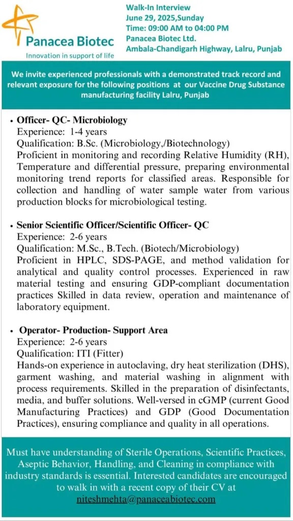 Panacea Biotec- Walk-In Interview for QC & Production on 29 June 2025 Panacea Biotec- Walk-In Interview for QC & Production on 29 June 2025 Post Views: 284 Job Category: Pharma Job Type: Full Time Job Location: lalru panjab Apply for this position Full Name *Email *Phone *Cover Letter *Upload CV/Resume *Allowed Type(s): .pdf, .doc, .docxBy using this form you agree with the storage and handling of your data by this website. *