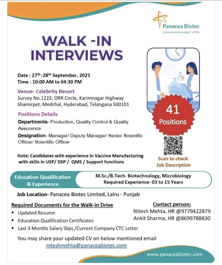 Panacea Biotec- Walk-In Interview for Production, QC & QA on 27th–28th Sept, 2025 Panacea Biotec- Walk-In Interview for Production, QC & QA on 27th–28th Sept, 2025 Post Views: 632 Job Category: Pharma Job Type: Full Time Job Location: lalru panjab Apply for this position Full Name *Email *Phone *Cover Letter *Upload CV/Resume *Allowed Type(s): .pdf, .doc, .docxBy using this form you agree with the storage and handling of your data by this website. *