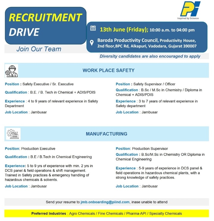 PI Industries- Walk in Interview for Safety and production on 13th June 2025