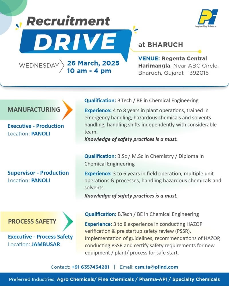 PI Recruitment -Drive For On 26th March 2025 PI Recruitment -Drive For On 26th March 2025 Post Views: 983 Job Category: Pharma Job Type: Full Time Job Location: Bharuch (Gujarat). Apply for this position Full Name *Email *Phone *Cover Letter *Upload CV/Resume *Allowed Type(s): .pdf, .doc, .docxBy using this form you agree with the storage and handling of your data by this website. *