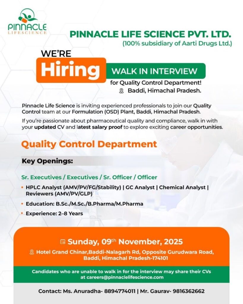 Pinnacle Life Science- Walk-In Interview for Quality Control on 09th November 2025@ Baddi Pinnacle Life Science- Walk-In Interview for Quality Control on 09th November 2025@ Baddi Post Views: 327 Job Category: Pharma Job Type: Full Time Job Location: Baddi Apply for this position Full Name *Email *Phone *Cover Letter *Upload CV/Resume *Allowed Type(s): .pdf, .doc, .docxBy using this form you agree with the storage and handling of your data by this website. *