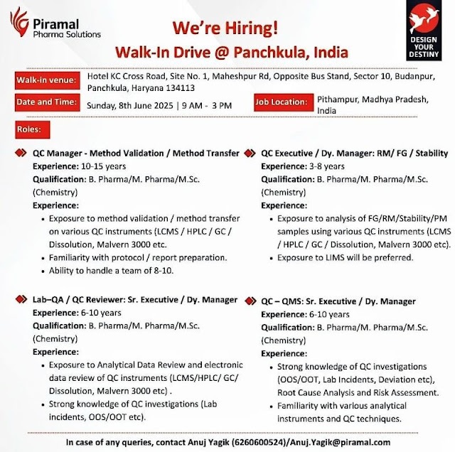 Piramal Pharma-Walk in Drive for M.Pharm, B.Pharm, MSc in QA and QC on 8th June 2025