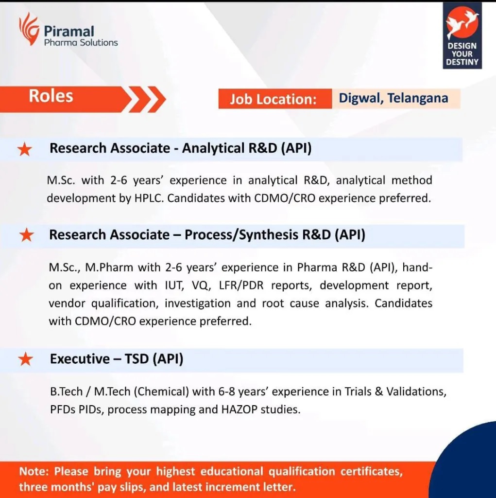 M.Sc., M.Pharm with 2-6 years’ experience in Pharma R&D (API), hand- on experience with IUT, VQ, LFR/PDR reports, development report, vendor qualification, investigation and root cause analysis. Candidates with CDMO/CRO experience preferred.