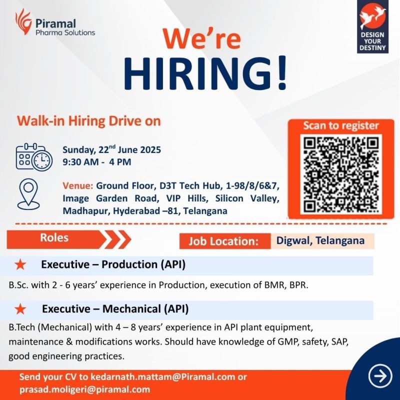 Piramal Pharma- Walk-In Interview For Production & Machanical (API) on June 22, 2025 Piramal Pharma- Walk-In Interview For Production & Machanical (API) on June 22, 2025 Post Views: 859 Job Category: Pharma Job Type: Full Time Job Location: Digwal Apply for this position Full Name *Email *Phone *Cover Letter *Upload CV/Resume *Allowed Type(s): .pdf, .doc, .docxBy using this form you agree with the storage and handling of your data by this website. *