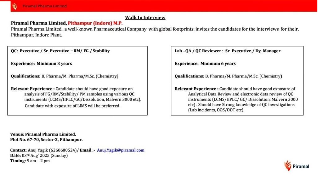Qualifications: B. Pharma, M. Pharma, or M.Sc. (Chemistry)
