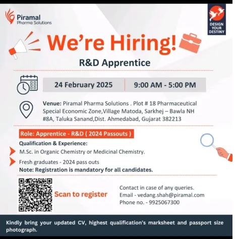 Piramal Pharma-Walk-in Interview for R&D Freshers on 24th Feb 2025