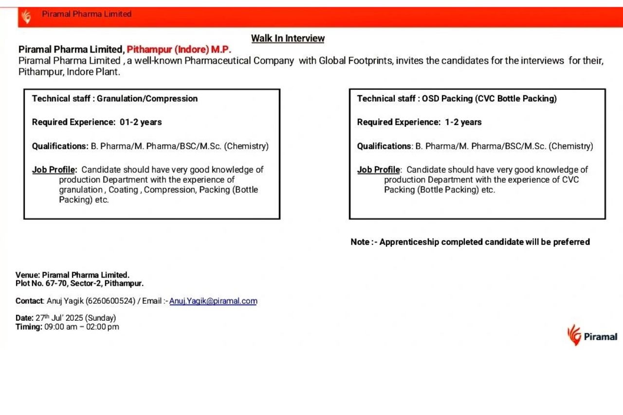 Piramal Pharma- Walk-In for OSD Production @Pithampur on 27th July 2025