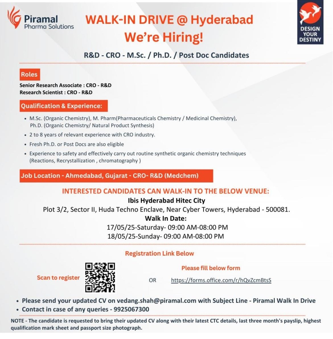 Piramal- Walk In Interview For R&D on 17th& 18th May 2025 Piramal- Walk In Interview For R&D on 17th& 18th May 2025 Post Views: 774 Job Category: Pharma Job Type: Full Time Job Location: Ahmedabad Apply for this position Full Name *Email *Phone *Cover Letter *Upload CV/Resume *Allowed Type(s): .pdf, .doc, .docxBy using this form you agree with the storage and handling of your data by this website. *