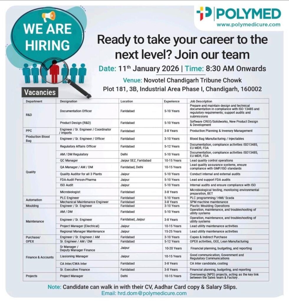Poly Medicure is hiring for a wide range of departments. Below are the key roles available: