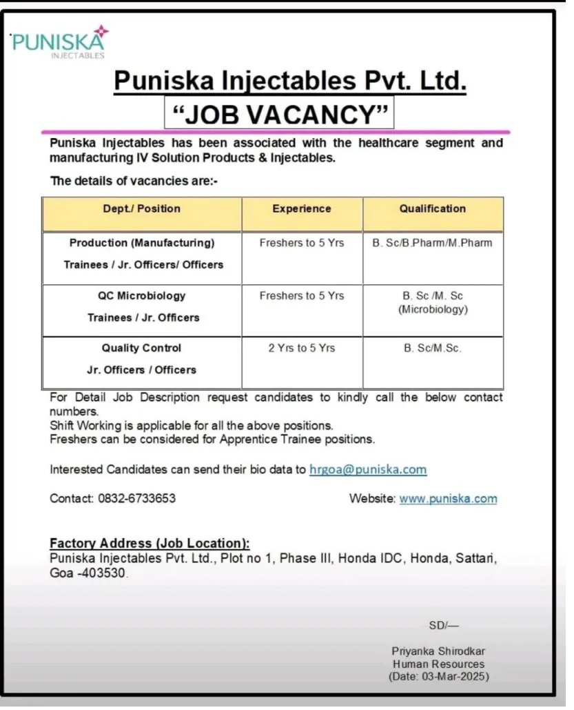 Puniska – Hiring for Freshers Production, QC Micro, QC Jobs Puniska – Hiring for Freshers Production, QC Micro, QC Jobs Post Views: 926 Job Category: Pharma Job Type: Full Time Job Location: goa Apply for this position Full Name *Email *Phone *Cover Letter *Upload CV/Resume *Allowed Type(s): .pdf, .doc, .docxBy using this form you agree with the storage and handling of your data by this website. *