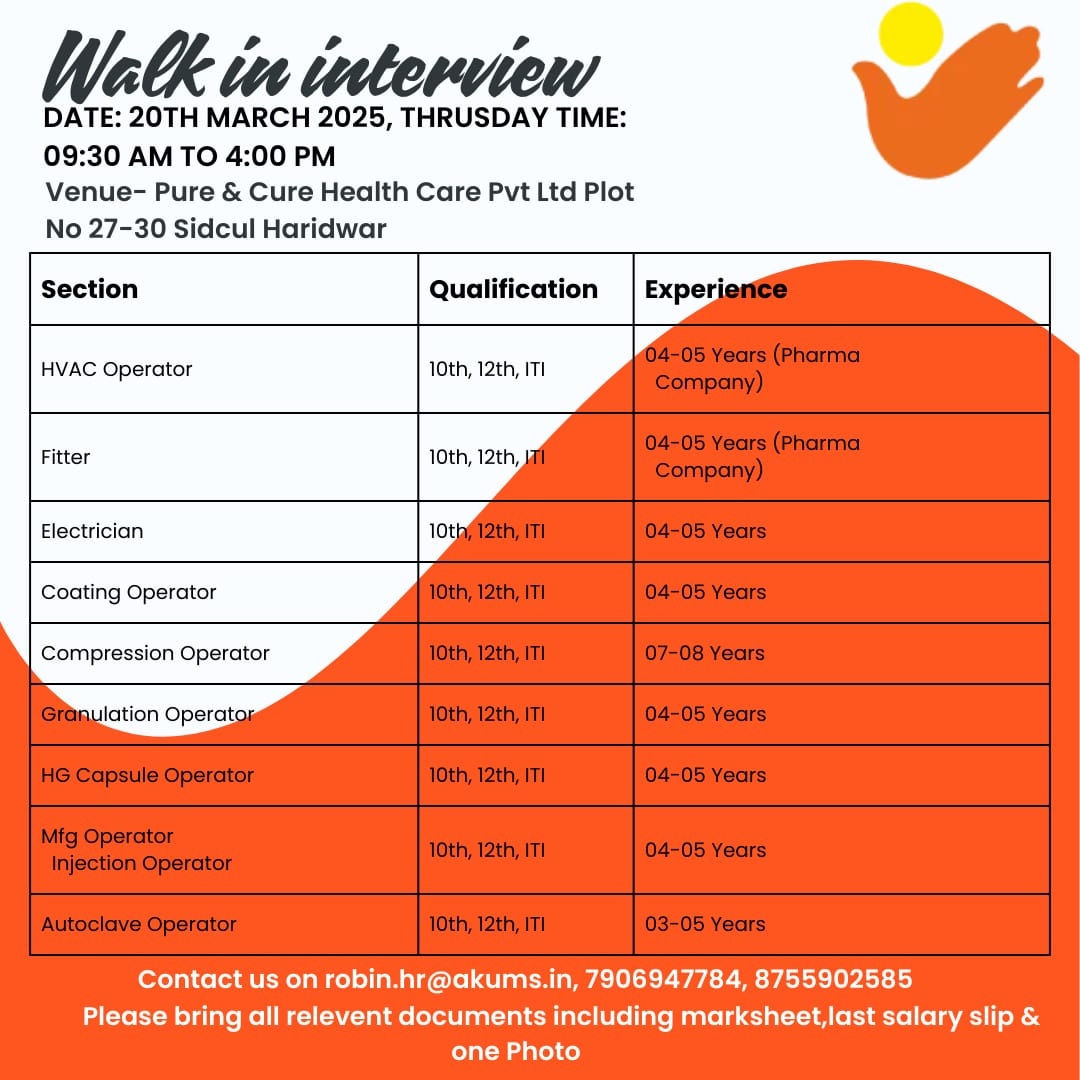 Pure & Cure Health Care Pvt Ltd-Walk in interview on 20TH MARCH 2025