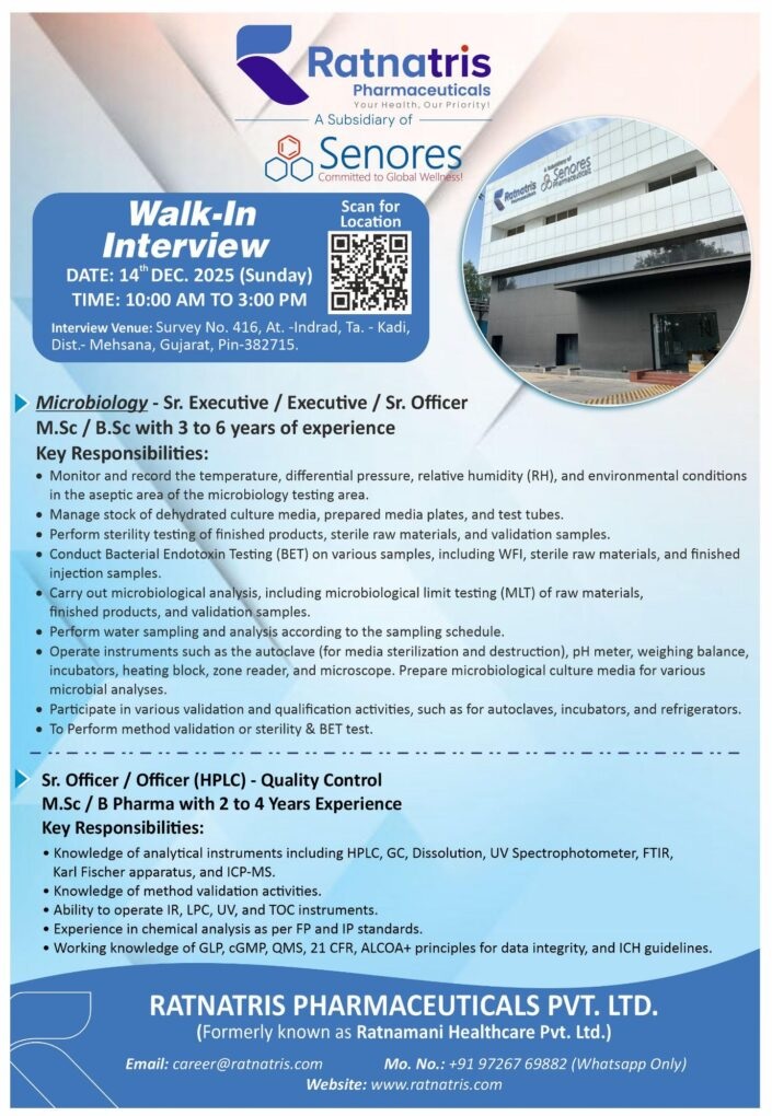 Ratnatris Pharmaceuticals Pvt. Ltd. (formerly Ratnamani Healthcare Pvt. Ltd.) — a trusted name in quality healthcare and a proud subsidiary of Senores Lifesciences — is conducting a Walk-In Interview for multiple positions in Microbiology and Quality Control (HPLC).