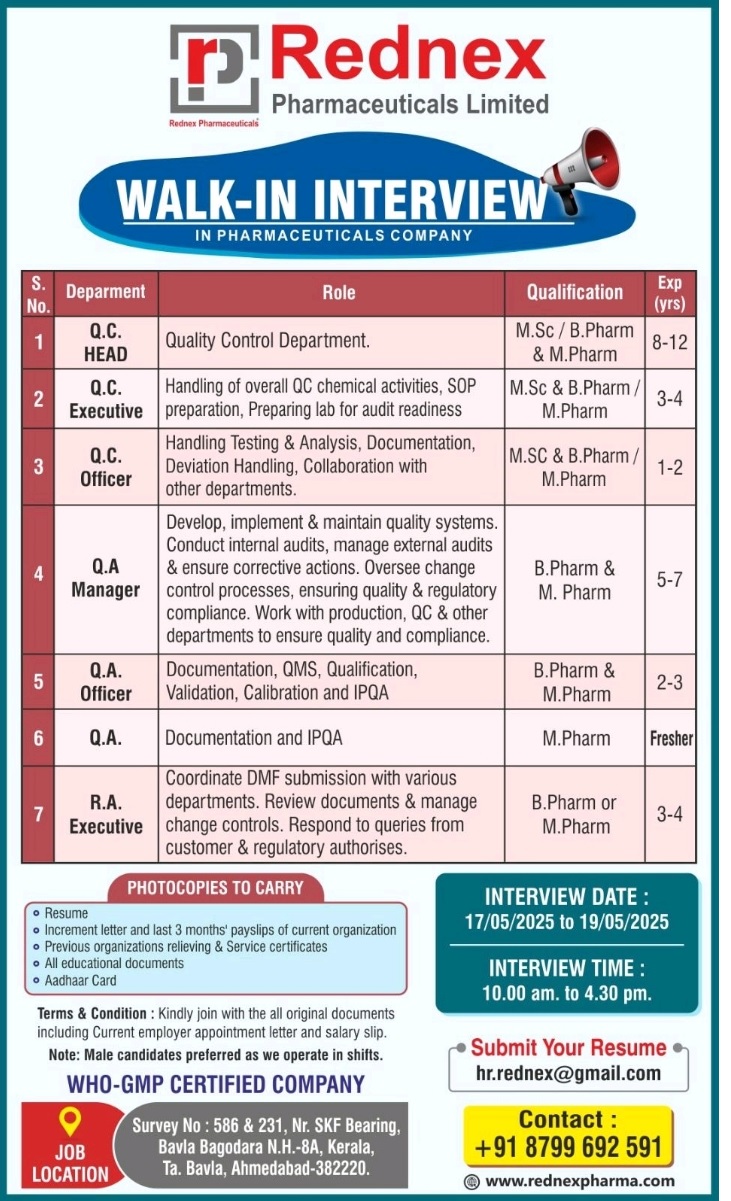 Rednex Pharma-Walk in interview for QA, QC and RA on 17 to 19 may 2025 @ Ahmedabad
