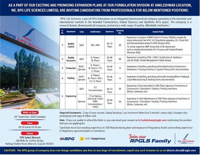 RPG Life Sciences-Interview for M.Pharm, B.Pharm, MSc in Production, QA, QC, Packing on 28th September 2025