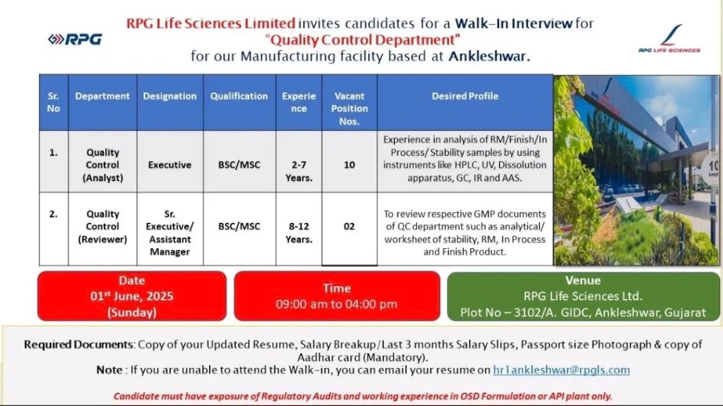 RPG Life Sciences Limited, a leading name in the pharmaceutical industry, is conducting a walk-in interview for its Quality Control Department at its Ankleshwar manufacturing facility. The event is scheduled for Sunday, 1st June 2025, from 9:00 AM to 4:00 PM, offering a golden opportunity for qualified professionals to join a dynamic and quality-focused organization.