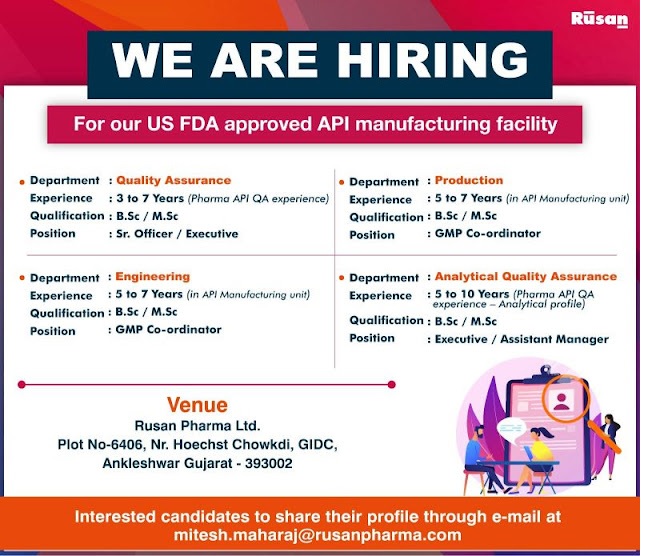 Rusan Pharma- Hiring for Quality Assurance (QA), Engineering, Production, and AQA @Ankleshwar, Gujarat. Rusan Pharma- Hiring for Quality Assurance (QA), Engineering, Production, and AQA @Ankleshwar, Gujarat. Post Views: 422 Job Category: Pharma Job Type: Full Time Job Location: Ankleshwar Apply for this position Full Name *Email *Phone *Cover Letter *Upload CV/Resume *Allowed Type(s): .pdf, .doc, .docxBy using this form you agree with the storage and handling of your data by this website. *