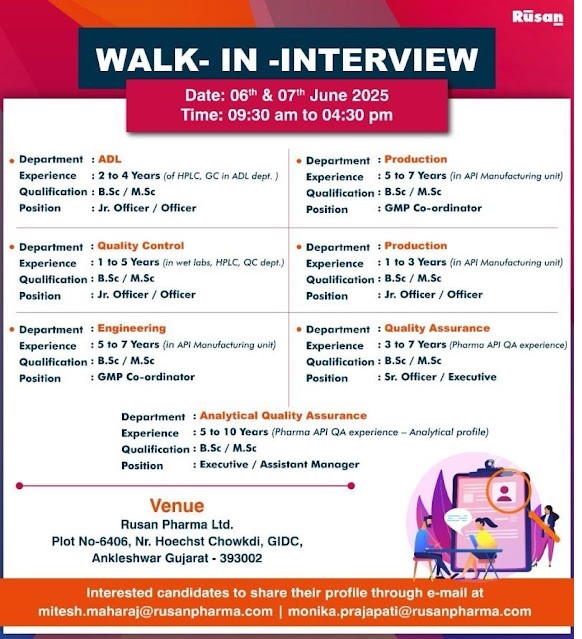 Rusan Pharma- Walk In Interview On For ADL, QC, Engineering, Production and QA 06th & 07th June 2025 @Ankleshwar Gujarat