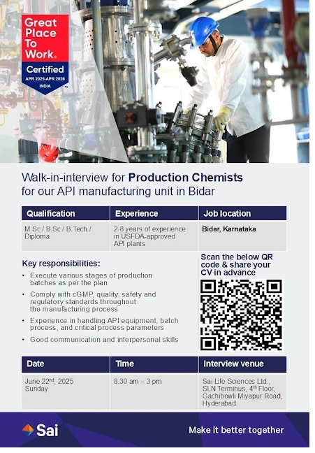 Walk-in-interview for Production Chemists for our API manufacturing unit in Bidar