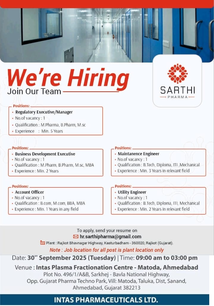 Sarthi Pharma -Openings for Regulatory, Engineering, Accounts & Business Development Apply Sarthi Pharma -Openings for Regulatory, Engineering, Accounts & Business Development Apply Post Views: 245 Job Category: Pharma Job Type: Full Time Job Location: Ahmedabad Apply for this position Full Name *Email *Phone *Cover Letter *Upload CV/Resume *Allowed Type(s): .pdf, .doc, .docxBy using this form you agree with the storage and handling of your data by this website. *