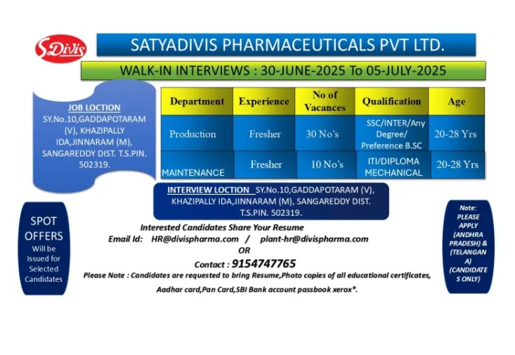 WALK-IN-INTERVIEW @ Satyadivis Pharmaceuticals Pvt. Ltd Interviews will be held on 1st to 5th July, 2025 for Freshers in Production / Maintenance Departments at Hyderabad.