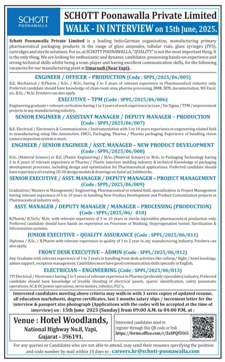 SCHOTT POONAWALLA-WALK-IN INTERVIEW on 15th June, 2025.