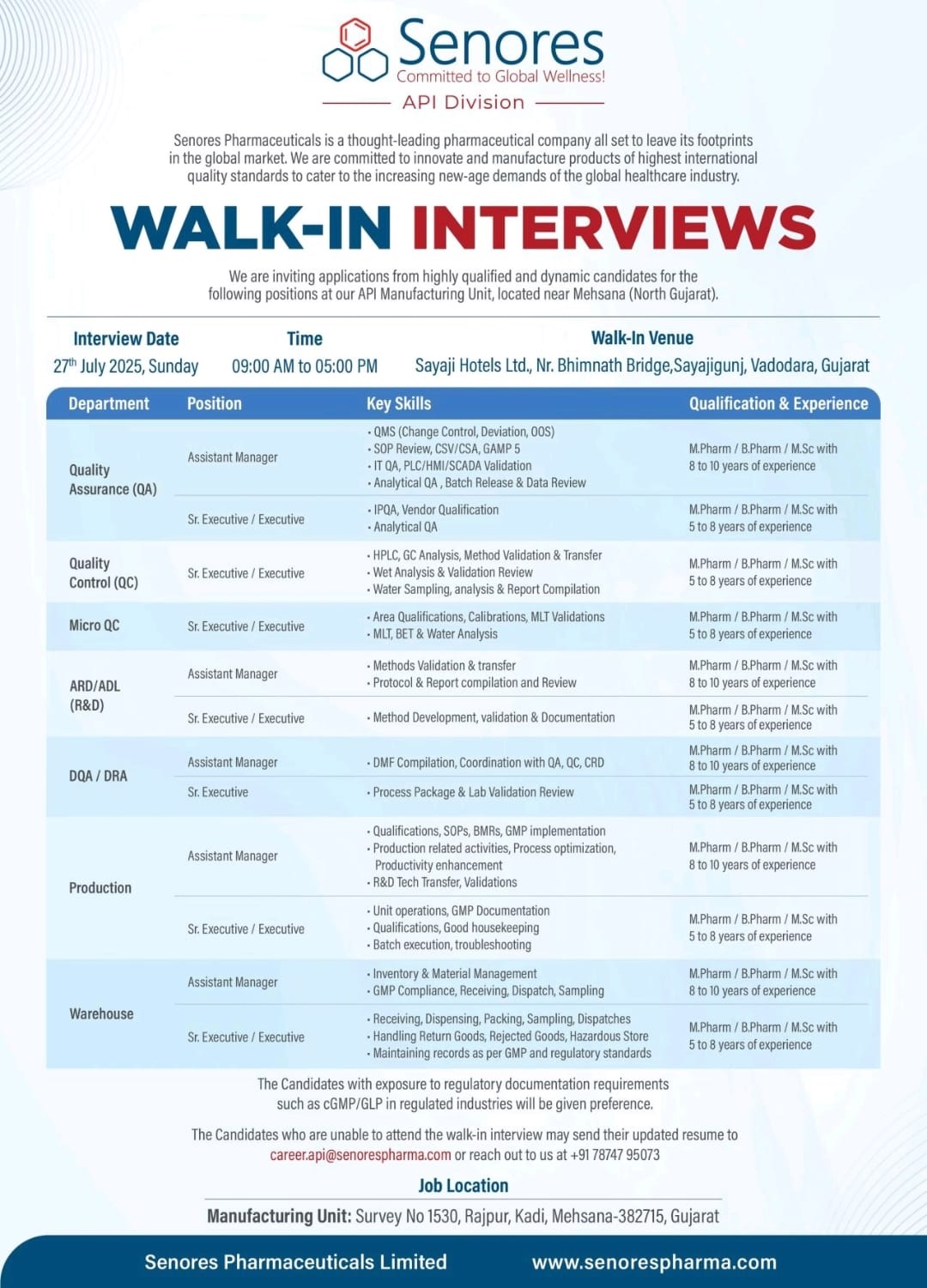 Senores Pharma-Walk in Drive for M.Pharm, B.Pharm, MSc in QA, QC, Micro QC, Production, ADL on 27th July 2025