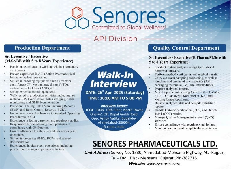 Senores Pharmaceuticals-Interview for MSc, BPharm in Production, QC Department on 26th Apr. 2025