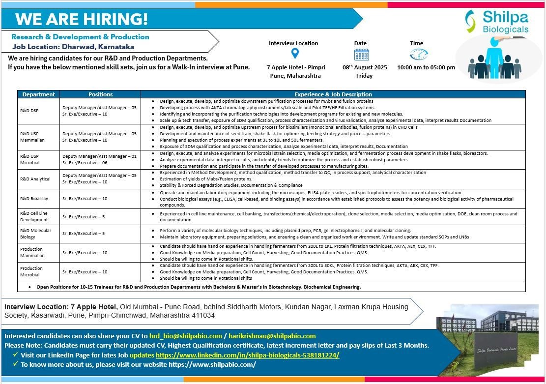 Shilpa Biologicals-Walk in for R&D & Production Departments on 8th August 2025