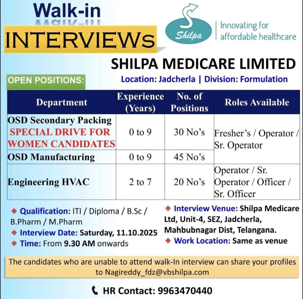 Shilpa Medicare Limited[95 Openings]-Walk-In Interviews on 11th October 2025 @ Jadcherla Shilpa Medicare Limited[95 Openings]-Walk-In Interviews on 11th October 2025 @ Jadcherla Post Views: 605 Job Category: Pharma Job Type: Full Time Job Location: SEZ Unit-4 Apply for this position Full Name *Email *Phone *Cover Letter *Upload CV/Resume *Allowed Type(s): .pdf, .doc, .docxBy using this form you agree with the storage and handling of your data by this website. *