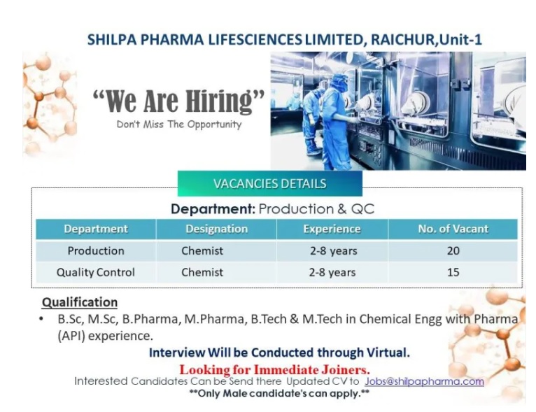 Shilpa Pharma Lifesciences Limited, We are hiring B.Sc, M.Sc, B.Pharm, M.Pharm, B.Tech, M.Tech With (pharma (API) for Chemist in Quality Control / Production at Unit- I, Raichur, Karnataka.