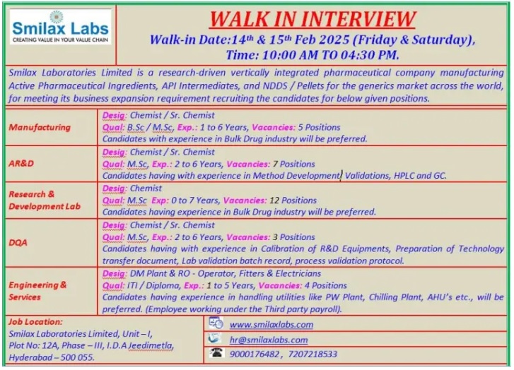 Smilax Laboratories Limited. Smilax Laboratories – Walk-In Interview for Manufacturing / DQA/Analytical R&D / R&D / Engineering Services Department on 14th & 15th Feb’ 2025