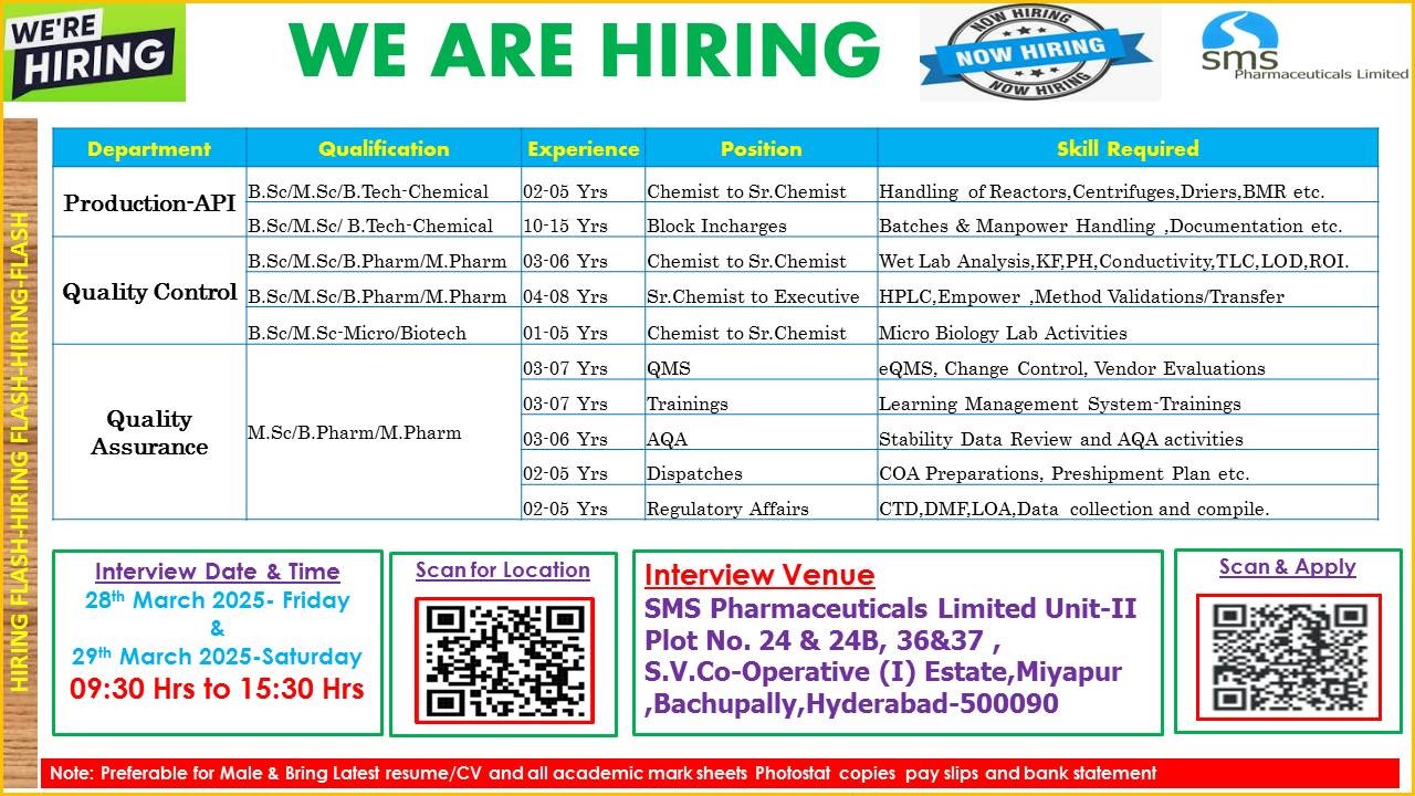 SMS Pharma- Walk In Interview On 28 & 29th March 2025 SMS Pharma- Walk In Interview On 28 & 29th March 2025 Post Views: 1,269 Job Category: Pharma Job Type: Full Time Job Location: Hyderabad Apply for this position Full Name *Email *Phone *Cover Letter *Upload CV/Resume *Allowed Type(s): .pdf, .doc, .docxBy using this form you agree with the storage and handling of your data by this website. *