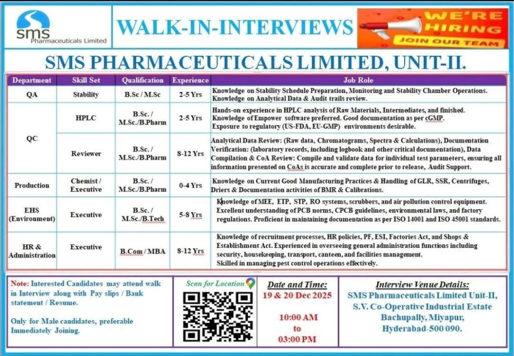 SMS Pharmaceuticals-Walk in for BPharm, MSc, BSc in QA, QC, Production on 19 & 20 Dec 2025