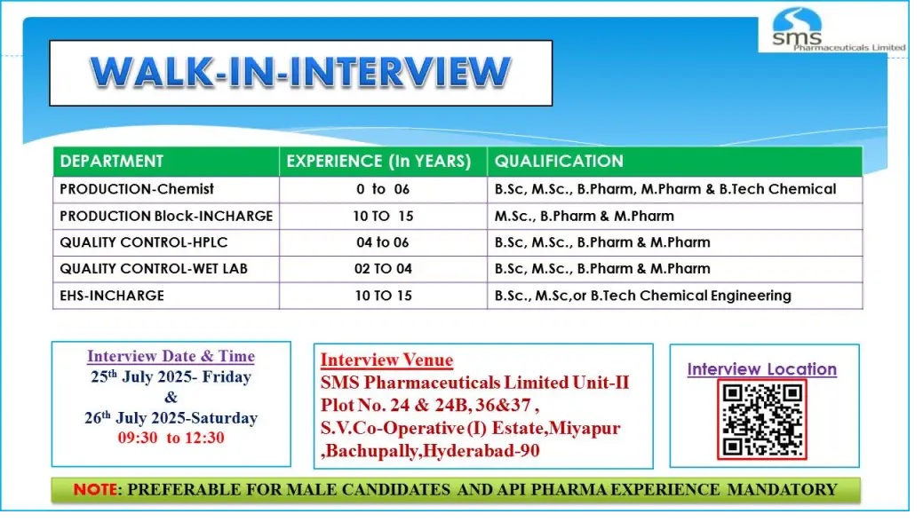 SMS Pharmaceuticals- Walk-In for API Manufacturing on 25th-26th July 2025@Hyderabad SMS Pharmaceuticals- Walk-In for API Manufacturing on 25th-26th July 2025@Hyderabad Post Views: 335 Job Category: Pharma Job Type: Full Time Job Location: Bachupally Miyapur Apply for this position Full Name *Email *Phone *Cover Letter *Upload CV/Resume *Allowed Type(s): .pdf, .doc, .docxBy using this form you agree with the storage and handling of your data by this website. *