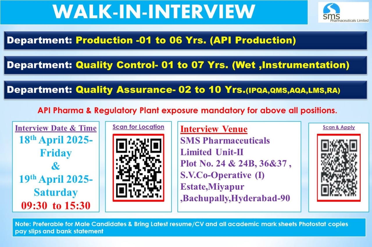 SMS- Walk In Interview For Production/ QC & QA on 18th & 19th April 2025 SMS- Walk In Interview For Production/ QC & QA on 18th & 19th April 2025 Post Views: 947 Job Category: Pharma Job Type: Full Time Job Location: Hyderabad SMS Pharmaceuticals Limited Unit-II Apply for this position Full Name *Email *Phone *Cover Letter *Upload CV/Resume *Allowed Type(s): .pdf, .doc, .docxBy using this form you agree with the storage and handling of your data by this website. *