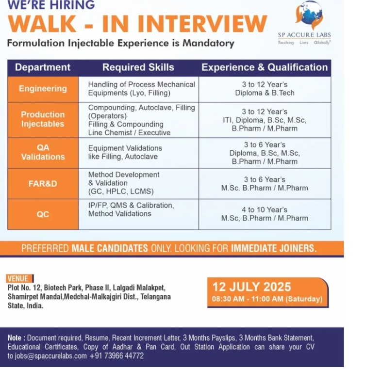 SP Accure Labs Pvt. Ltd – Walk-In Interviews for Production / QC/QA/FAR&D / Engineering on 12th July’ 2025
