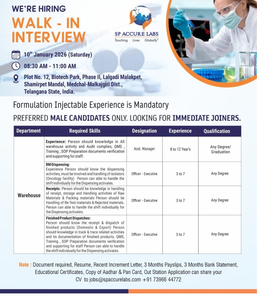 SP Accure Labs -Walk-In Interview for Injectable Formulation & Warehouse on 10th January 2026 @ Hyderabad