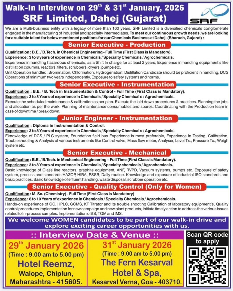 SRF Limited- Walk-In Interview for Production Chemical, Instrumentation, Mechanical & QC on 29 th & 31th January 2026 SRF Limited- Walk-In Interview for Production Chemical, Instrumentation, Mechanical & QC on 29 th & 31th January 2026 Post Views: 7 Job Category: Pharma Job Type: Full Time Job Location: Dahej Gujarat Apply for this position Full Name *Email *Phone *Cover Letter *Upload CV/Resume *Allowed Type(s): .pdf, .doc, .docxBy using this form you agree with the storage and handling of your data by this website. *