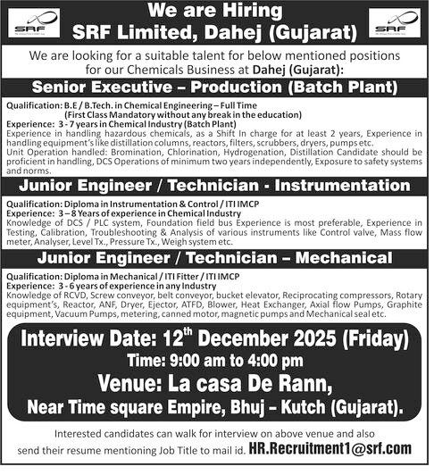 SRF Limited, a prominent name in the chemical manufacturing industry, is expanding its team at the state-of-the-art Dahej, Gujarat facility. We are seeking qualified and experienced professionals for immediate hiring through a walk-in interview event. This is an excellent opportunity for candidates looking for full-time jobs in the Chemical Business sector.