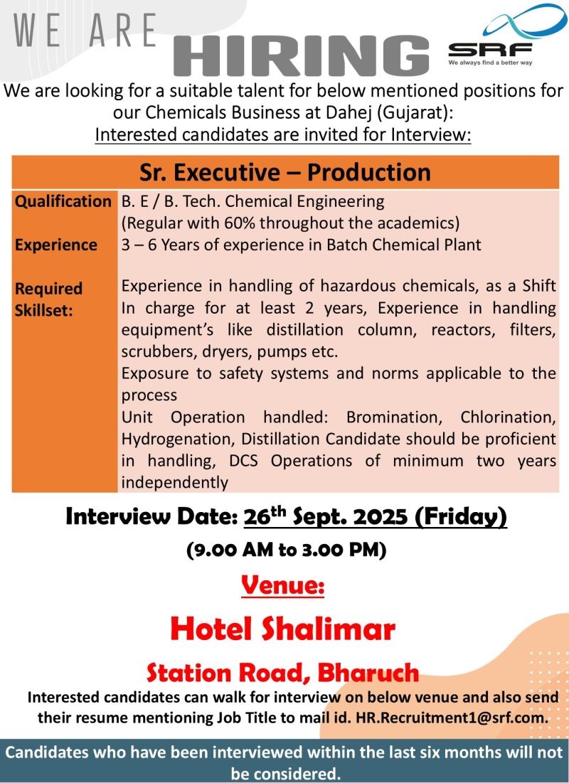 SRF- Walk In Interview For Production on 26th September 2025 SRF- Walk In Interview For Production on 26th September 2025 Post Views: 713 Job Category: Pharma Job Type: Full Time Job Location: Bharuch (Gujarat). Apply for this position Full Name *Email *Phone *Cover Letter *Upload CV/Resume *Allowed Type(s): .pdf, .doc, .docxBy using this form you agree with the storage and handling of your data by this website. *