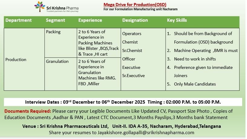 Sri Krishna Pharma -Drive for Production (OSD) on 3rd to 6th December 2025 @ Nacharam Unit Sri Krishna Pharma -Drive for Production (OSD) on 3rd to 6th December 2025 @ Nacharam Unit Post Views: 235 Job Category: Pharma Job Type: Full Time Job Location: Hyderabad Apply for this position Full Name *Email *Phone *Cover Letter *Upload CV/Resume *Allowed Type(s): .pdf, .doc, .docxBy using this form you agree with the storage and handling of your data by this website. *