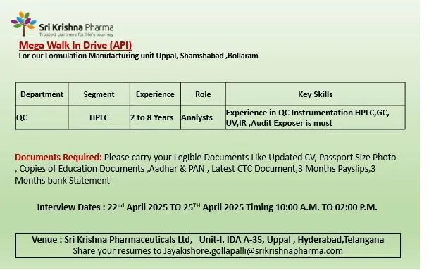 Venue: Sri Krishna Pharmaceuticals Ltd, Unit-I. IDA A-35, Uppal, Hyderabad, Telangana