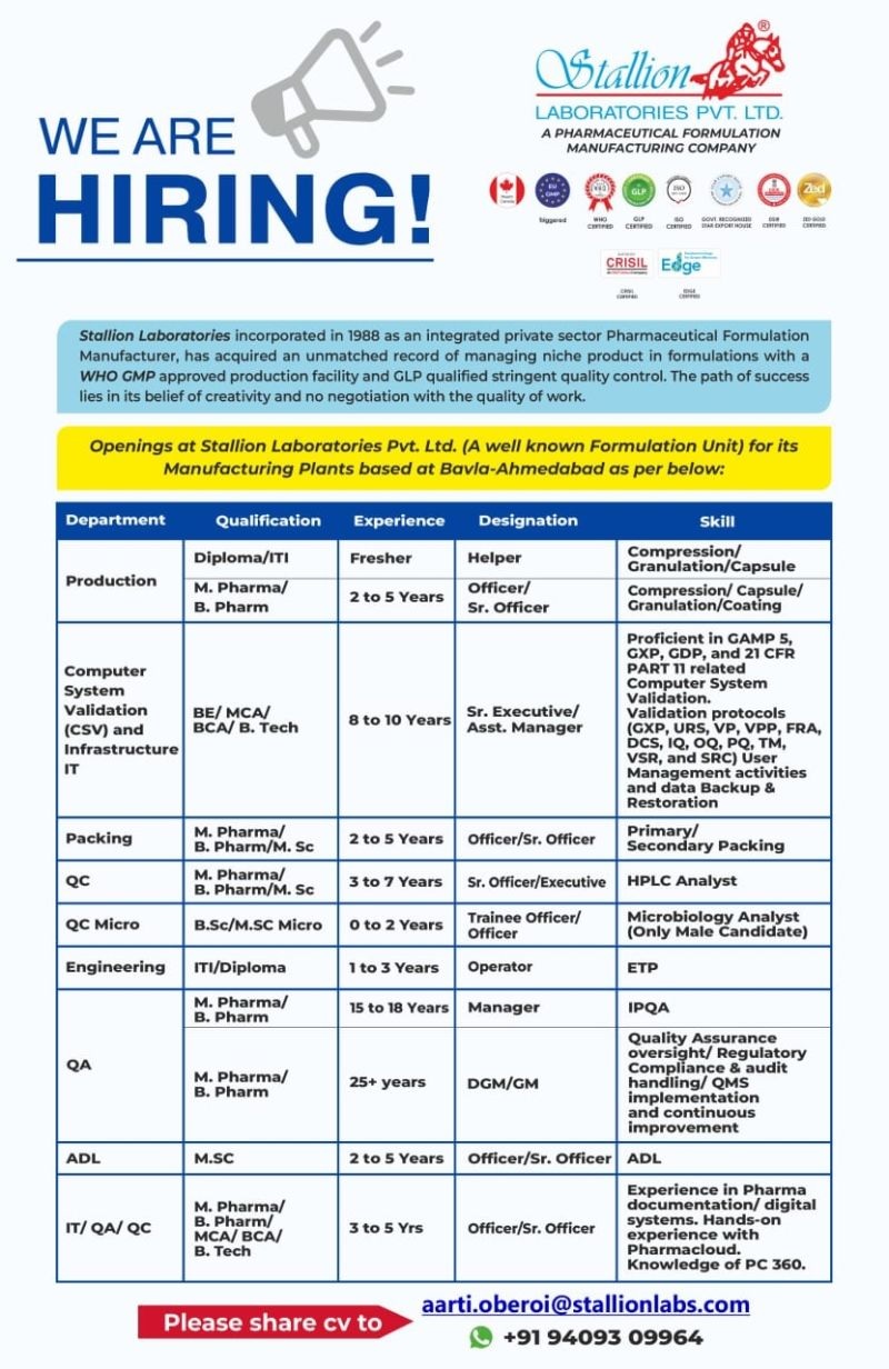 Openings at Stallion Laboratories Pvt. Ltd. For following Positions at OSD Formulation facility – Unit-ll