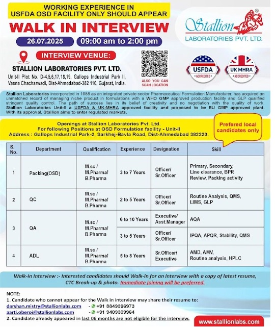 Stallion Laboratories -Walk in Interview for QC, QA & ADL, Packing On 26th July 2025 @ Ahmedabad