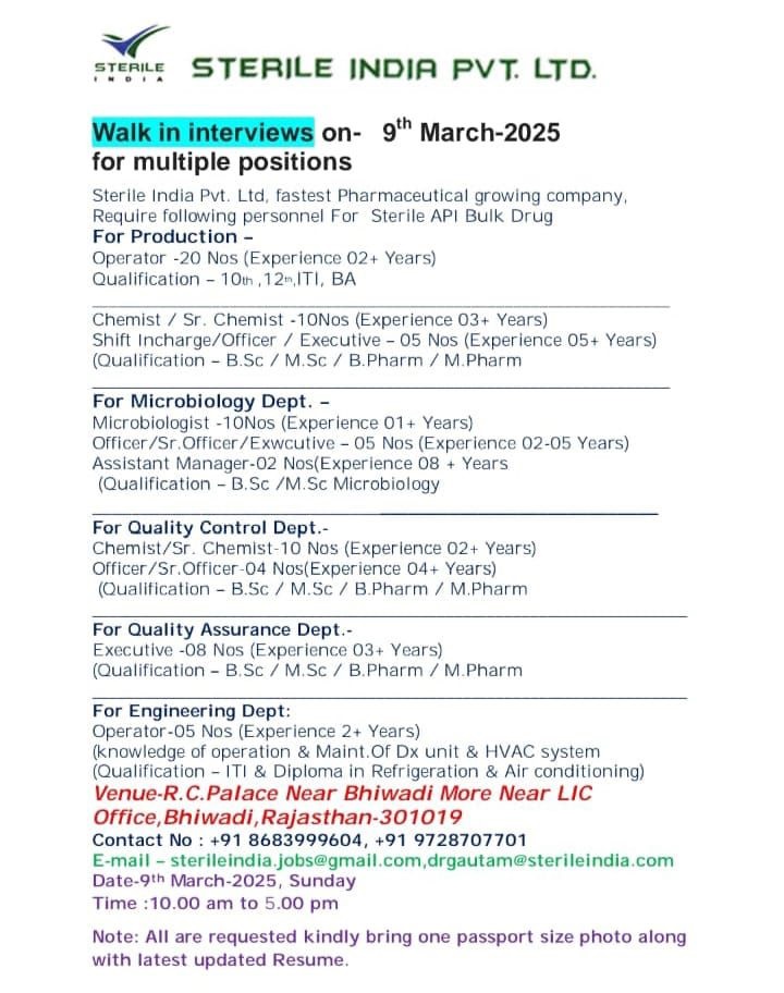 STERILE STERILE INDIA PVT. LTD. Walk in interviews on- 9th March-2025