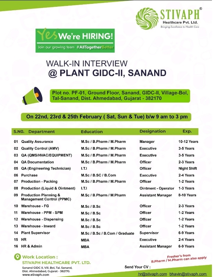 Interview Location : STIVAPH HEALTHCARE PVT. LTD, Plot no. PF-01, Ground Floor, Sanand, GIDC-II, Village-Bol, Tal-Sanand, Dist. Ahmedabad, Gujarat – 382170
