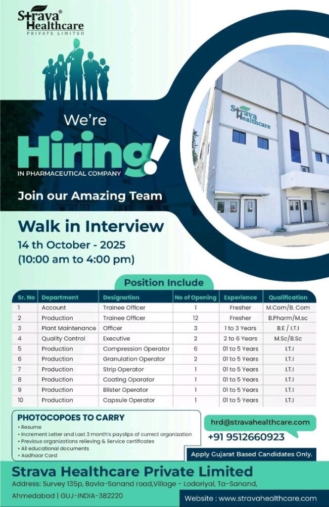 Strava Healthcare- Walk-In Interview for production Quality Control Maintenance, and Accounts facility on 14th October 2025 @Ahmedabad, Gujarat